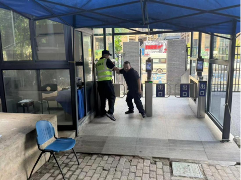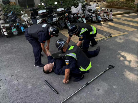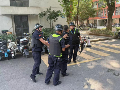 1名门岗值班队员立即按照应急预案,对歹徒进行口头警告,边阻止边向上级报告,而后3名应急小队成员与歹徒展开对峙,阻断歹徒继续进入校园并实施抓捕。